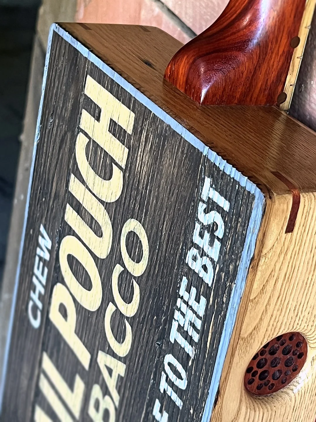 This four string, acoustic/electric guitar was made possible by Barb for the Mail Pouch bird house panel signed H. Warrick ’85, American chestnut from Hal, white oak recycled barn wood from John, and the scroll pegbox and tuning peg from Fred. Thanks to you all!