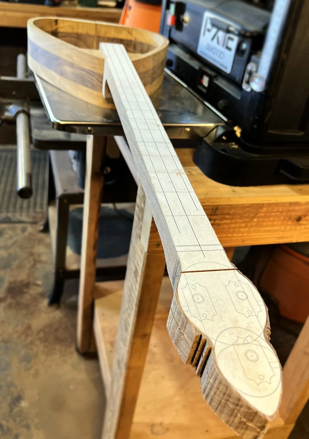 Here is an acoustic/electric, three string guitar with the body shaped like a guitar pick. Walnut and African teak was used with padauk accents. A guitar pick is inlaid at the top. The back is hand painted and distressed to imitate inlay.